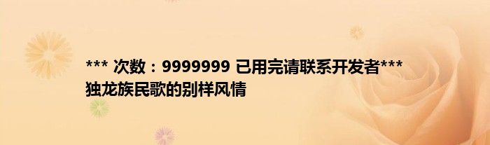 本文*** 次数:9999999 已用完请联系开发者*** 独龙族民歌的别样风情到此分享完毕,希望对大家有所帮助。
