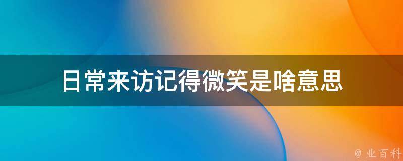 日常来访记得微笑的意思是无论发生了什么挫折都要微笑面对生活。这是一句励志的话语,鼓励我们时刻保持积极的态度并用微笑去面对生活中的各种挑战。通过微笑,我们不仅可以传递快乐和幸福的情绪,还可以影响他人的情绪和建立良好的人际关系。