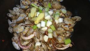7、然后下姜、大蒜、大葱,翻炒1分钟左右。