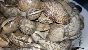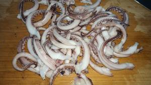 2、将花甲焯水后清洗,鱿鱼须焯水,改刀。