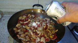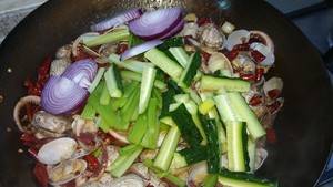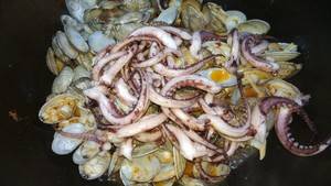 6、下花甲、鱿鱼,翻炒2分钟左右。