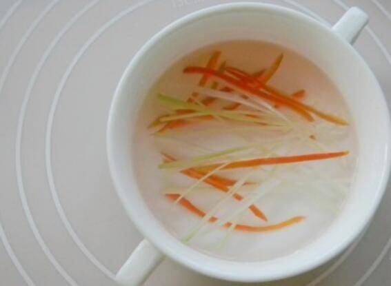 2.红椒和葱白切细丝泡水中待用。