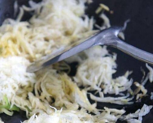 5.炒锅加入适量的油,爆香葱姜和五香粉,加入芥菜丝翻炒。