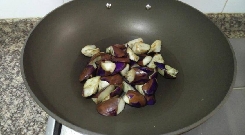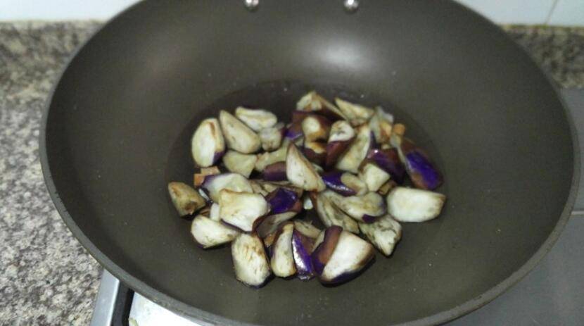 8、放入酱油和蚝油,翻炒至茄子软烂。