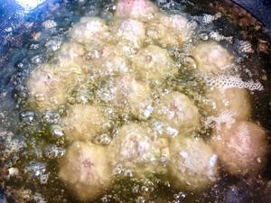 6、油锅七成热后放入丸子,小火慢炸到金黄色出锅即可。