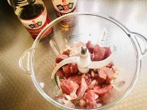 3、葱、姜、肉放入绞肉机绞好备用。