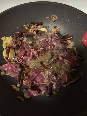 5、把牛干巴放入锅中继续大火翻炒。