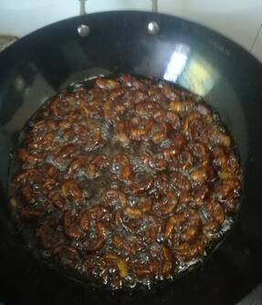 锅内放油,放入佐料、爆香放入爬蚱、撒料装盘即可。