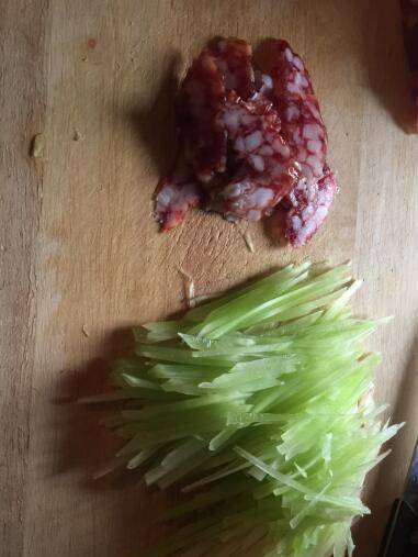 1、青笋切丝香肠切片。