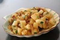 6、起油锅,把腊肉放进锅里炒香,下木薯粒、盐翻炒均匀,放适量水,加盖约5分钟,加酱油、葱翻炒至干锅即可。