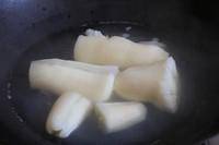 2、把剥了皮的木薯切成段,放到锅里用水煮,约1小时。