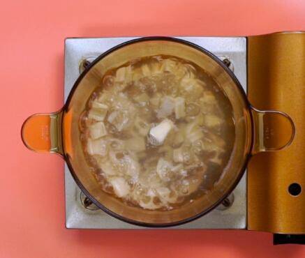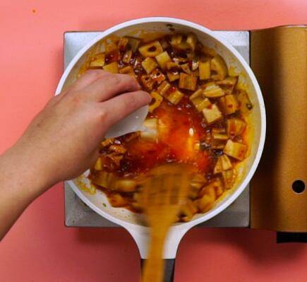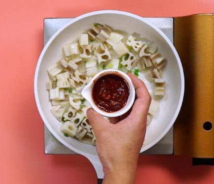 倒入食用油、葱花、藕丁,大火翻炒1分钟,倒入豆瓣酱,翻炒均匀。