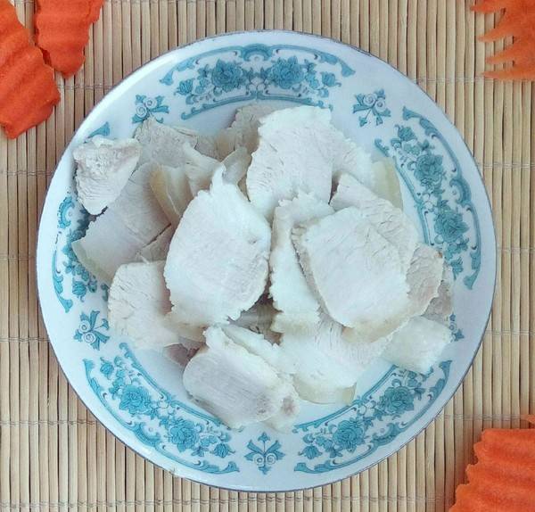 3、肉洗净用冷水(水里加入几滴料酒去腥)煮至八成熟,然后切成片备用。