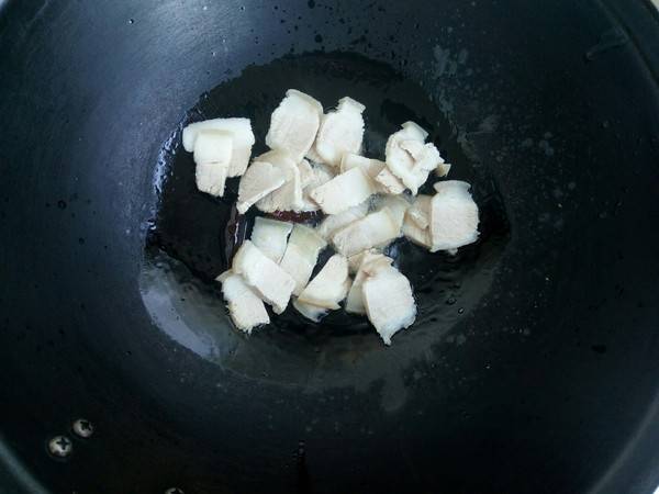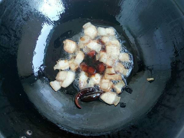 5、加入肉片翻炒至肥肉出油。