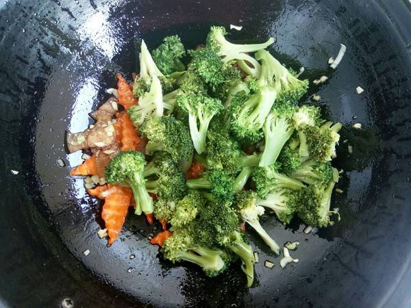 9、加入西兰花和调料翻炒匀即可。