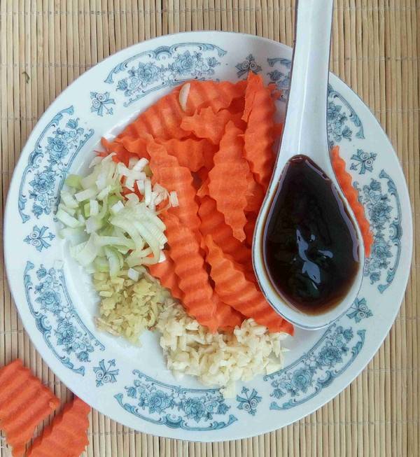 2、红萝卜洗净去皮,切成片。葱姜蒜均切粒。