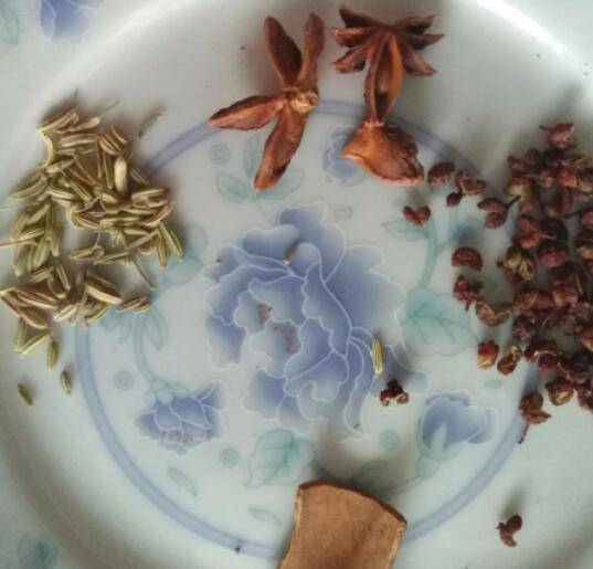 2.配料准备:主要是一些桂皮、茴香、八角、生姜、花椒,都是一些香料。还有点红糖和盐。