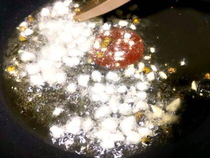 热锅冷油,四成油温爆香蒜粒和花椒(最好把花椒捞起来不要)。