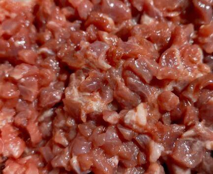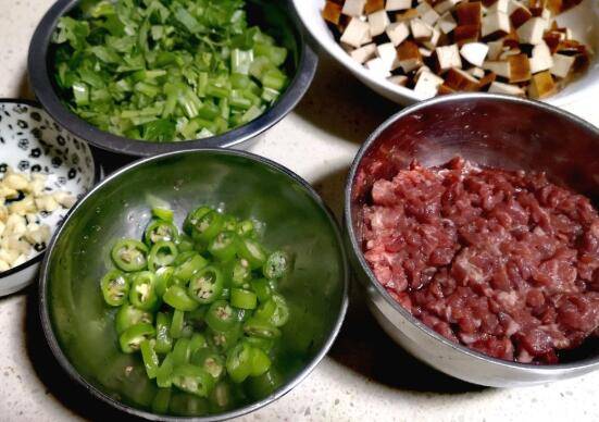 黄牛肉洗净血水,切成大约0.5*0.5cm的颗粒,豆腐干切成1cm*1cm的颗粒。