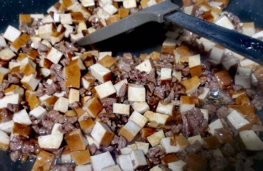 放入牛肉粒炒至全部变色,放入豆腐干颗粒翻炒一到两分钟。