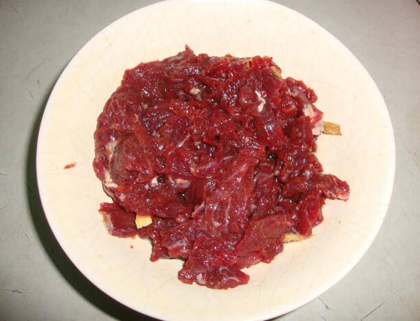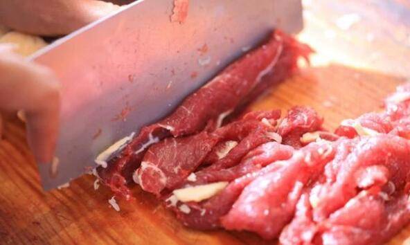 切牛肉的时候要注意,必须要横着切片,不要沿着它的纹路切。