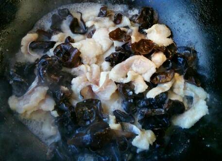 锅里倒油,先下入鱼片翻炒,然后放入木耳、盐、味精,倒入少许水炖一分钟。