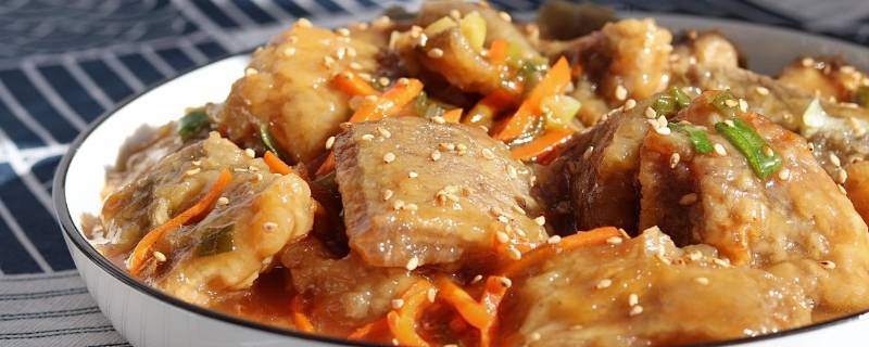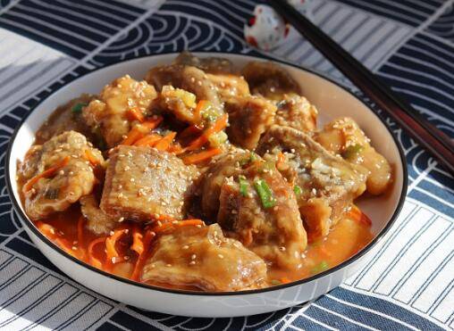 用料:炸老板鱼1盘、植物油少许、葱花少许、姜丝少许、胡萝卜丝少许、冰糖20g、蒸鱼酱油1勺、清香米醋2勺、熟白芝麻少许、淀粉1勺。