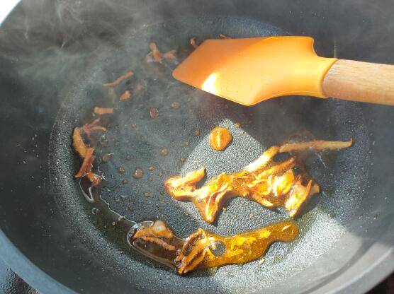 3、放入冰糖,中小火炒至融化。