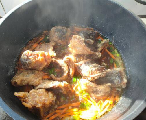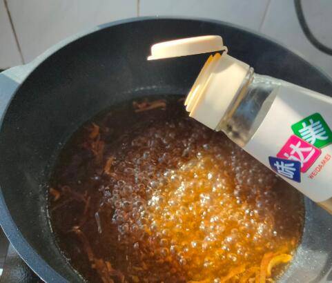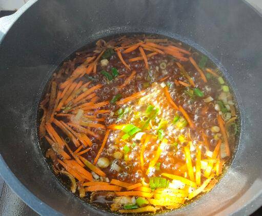 6、接着放入葱花、胡萝卜丝,炖煮1-2分钟。