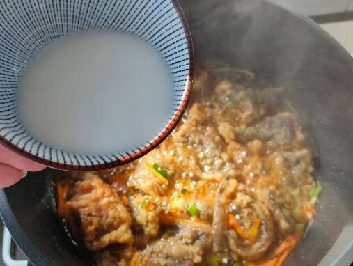 9、淀粉用清水搅拌均匀,淋入锅内。