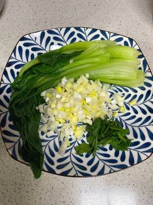 1、准备材料:葱花碎适量、青菜3颗、冰糖适量、牛肉适量、面条1份、酱油三勺、老抽半勺、八角一个、香叶两片。