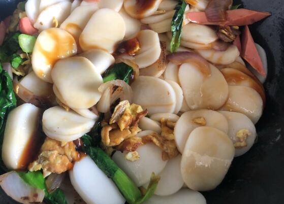 接着加入过过凉水的年糕,放入一勺蚝油,两勺生抽,适量盐,翻炒一分钟即可。