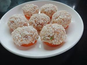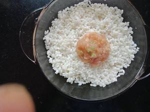 5、捏成肉丸子,然后将肉丸子裹上一圈糯米。