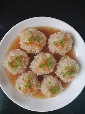 8、将汁水淋在蒸好的糯米肉丸子上,撒上几粒葱花和胡萝卜末即可。