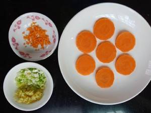 3、胡萝卜一部分切片,一部分切末,生姜切末,葱切末。