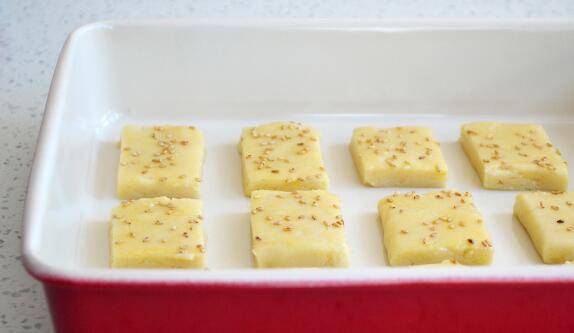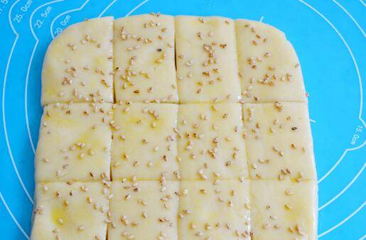 7、将方形面饼切成若干小方块,刷蛋液,撒白芝麻。