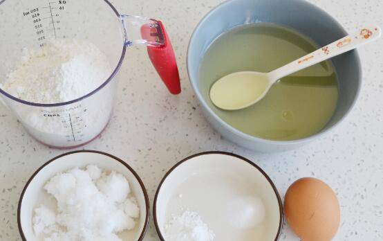 用料:低筋面粉250克、泡打粉4克、小苏打2克、玉米油100克、白糖70克、鸡蛋1个。