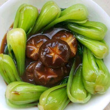 3、将香菇放入青菜中间。蚝油汁淋些在青菜上即可。