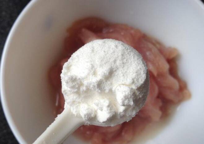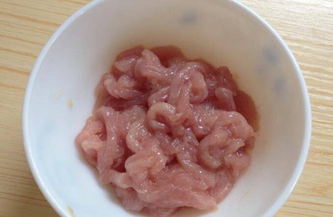 3.肉丝里调入1g盐、料酒和3g玉米淀粉。
