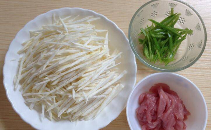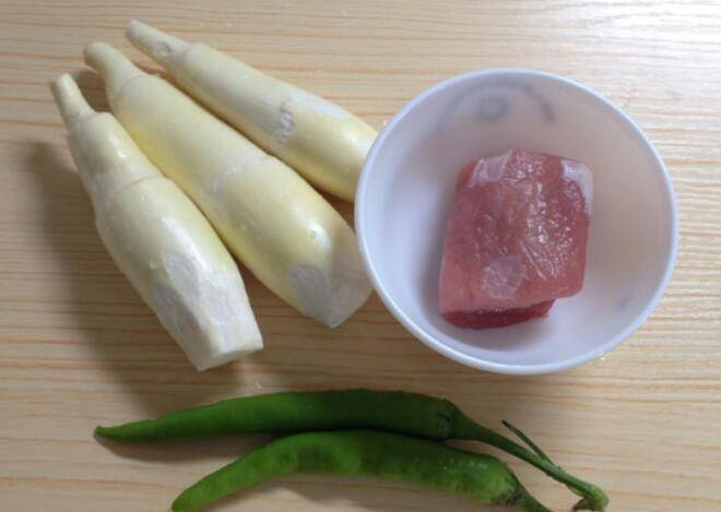 用料:茭白200克、里脊80克、油适量、盐4克、料酒3克、杭椒2根、鸡精1克。