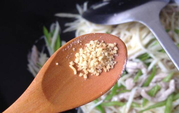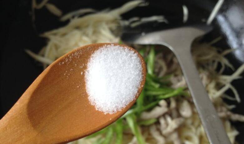 6.锅中留油,下入茭白丝,并调入2g盐,翻炒片刻。