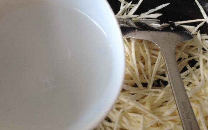 5.起油锅,开中火将油烧热后下入肉丝翻炒变白盛出。