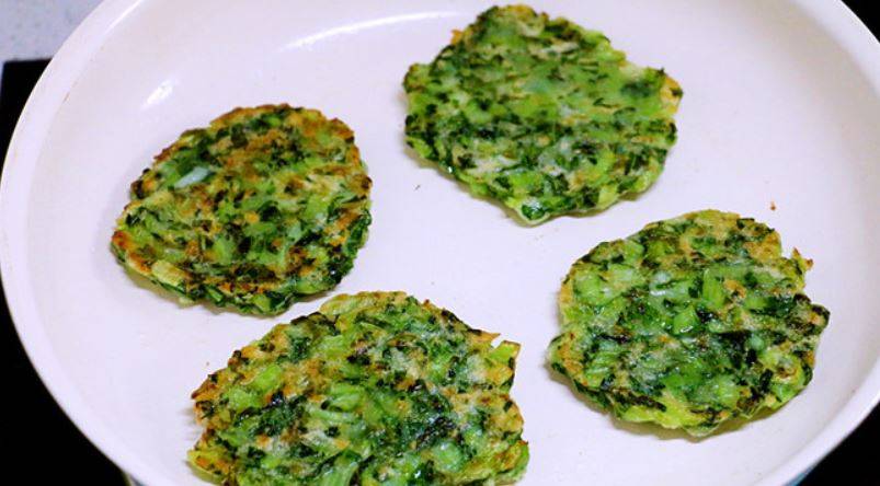 3、平底锅放少许油,用勺子舀一小勺面糊,压平压薄,小火煎,两面煎熟即可。