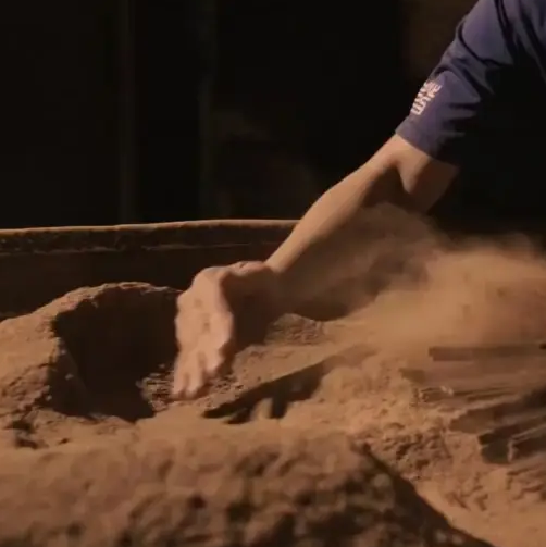 5、将各类原料粉根据比例拌匀后,用开水和烫,揉成面团状后用脚踩。第二天将其放入铜管中压制成线香。