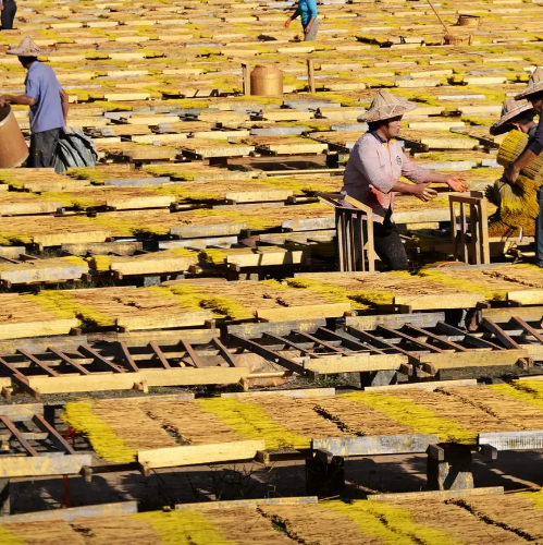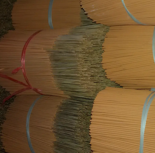 6、晒制,将制成的半成品在阳光下晾晒。晒至两头翘起后置于阴凉处,洒少量水放平后再吹干。最后是每支线香切成等长4段即最终完成。