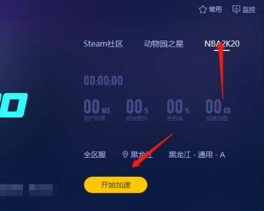 在选择加速器尽量选择带试用的,或者按时算费用的,这样比较划算。进入加速器页面,我们要加载NBA2k20游戏,点击开始加速。