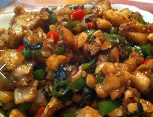 牛蛙切成小块,加入料酒、白醋、食盐腌制十分钟,锅内放油烧至八成熟,倒入牛蛙爆炒脱生。