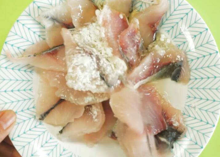 1、鱼片、淀粉、蛋清搅拌均匀进行腌制。