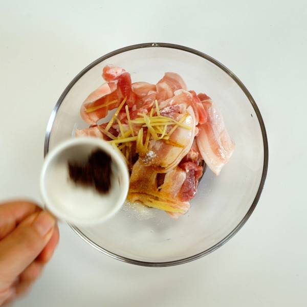 2、碗中放入猪五花、姜丝、生抽、糖、盐、豆瓣酱。