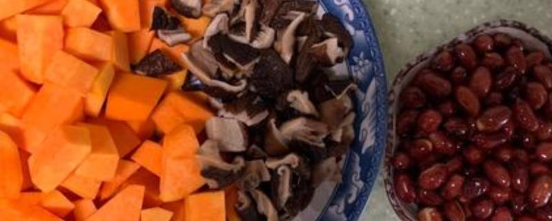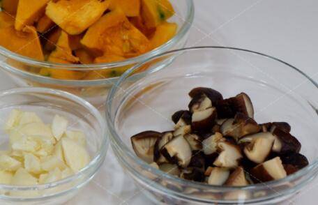 泡发好的香菇切成小块,南瓜去皮去籽切成小块,大蒜轻拍切小块。